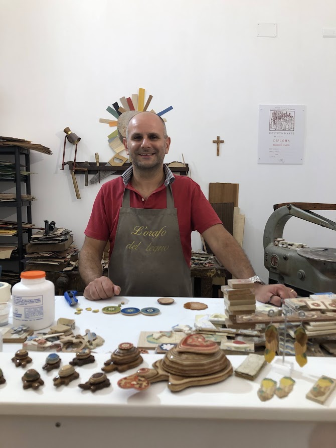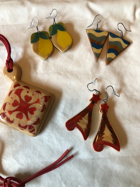 Sorrento is also known for their inlaid wood products. You will find many shops with beautiful inlaid wood designs on everything from furniture to music boxes. One evening we stumbled upon a very small shop where Antonio was making jewelry with inlaid wood. He took the time to explain and demonstrate the process to us and I purchased a few pieces of his artwork.