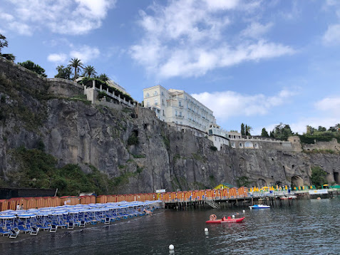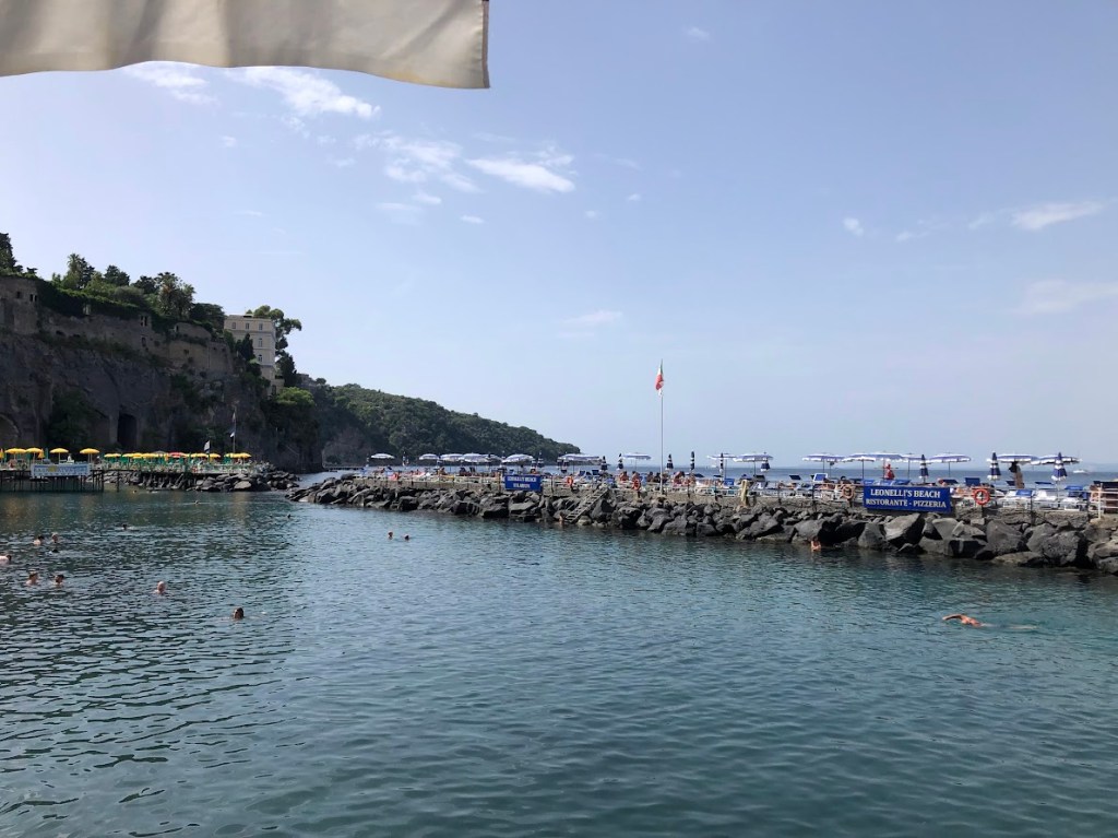 If you are interested in enjoying some beach time, the hotel has a lift that goes directly from the lobby and delivers you to a tunnel that leads through the cliffs to Leonelli’s beach club. Leonelli’s beach is a colorful sight with red and yellow striped changing huts, blue and white striped umbrellas, and blue sun loungers. For a small fee you can rent sun loungers and an umbrella for the day. You can set up on the pebbly beach or on the pier that hangs out over the water and surrounds the swimming area. There is a restaurant and snack bar on the pier with fresh seafood. The water is unbelievably clear and is warm enough to be comfortable. Spending the day sunning on the pier and swimming in the Bay of Naples was a highlight of our trip.