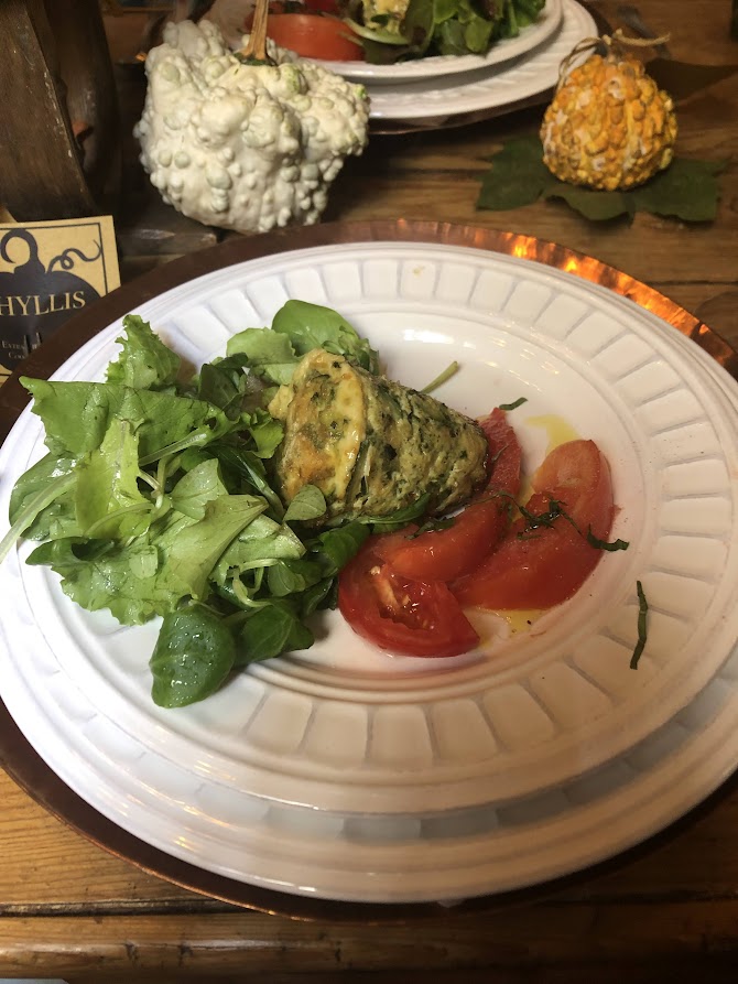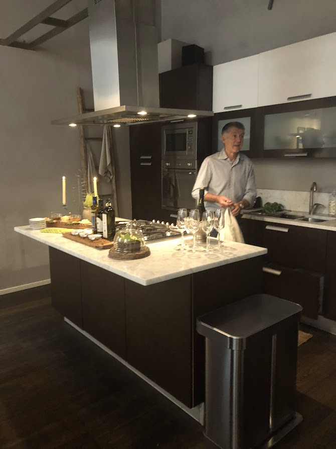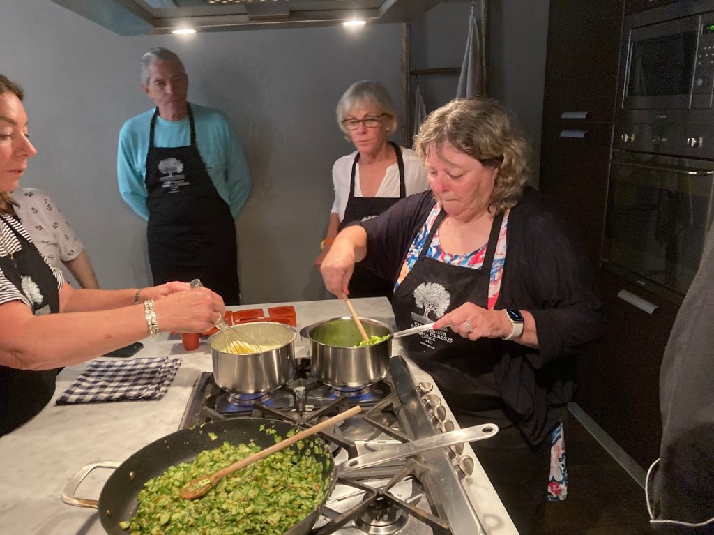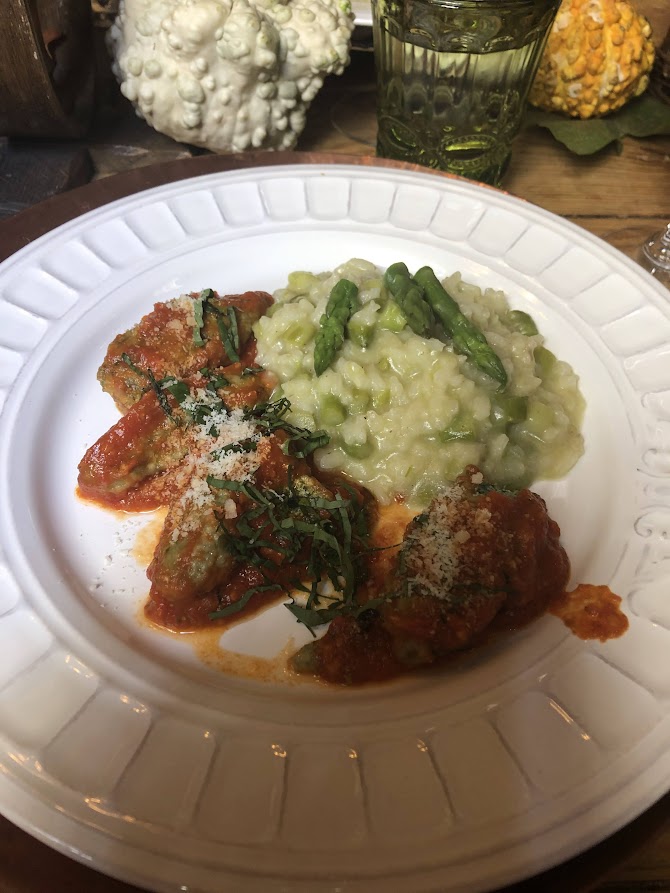 After shopping we proceeded to Guiseppe’s home where we prepared our meal. There were 8 of us in this class and it felt very intimate working together in Guiseppe’s kitchen. Our menu included an appetizer of a timbale accompanied by salad greens and fresh tomatoes, an entree of asparagus risotto and gnudi in tomato sauce, followed by a custard with fresh berries. As we were working on the meal, we tasted different types of focaccias paired with a variety of olive oils, pecorino cheeses, and honeys. Guiseppe is a very hands-on instructor and made sure that every person took part in preparing the meal.