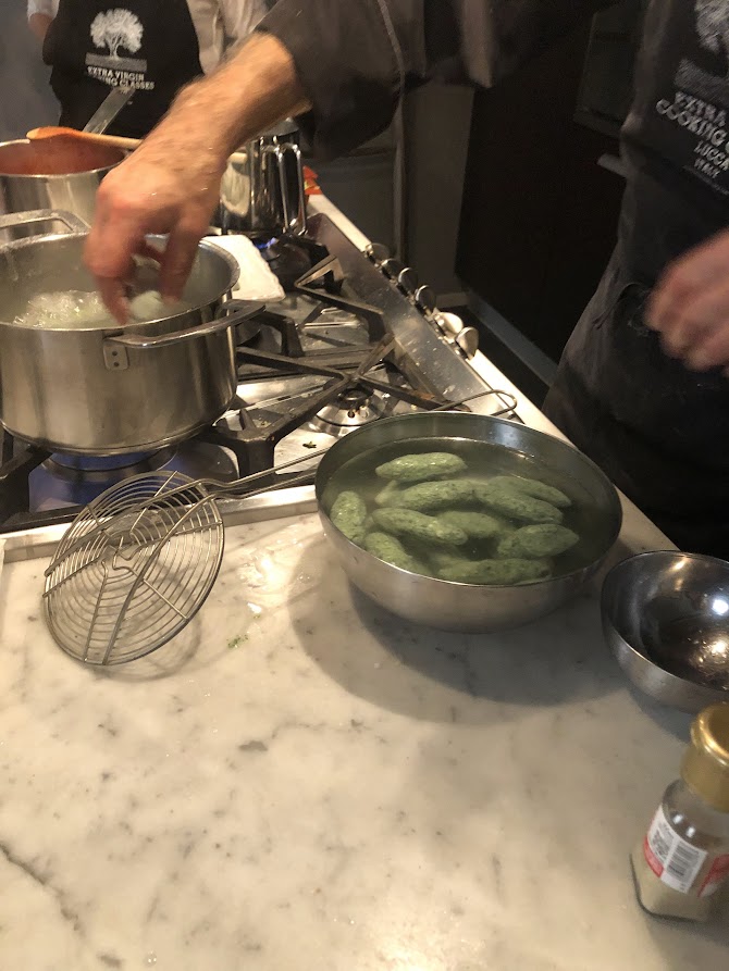 In our class we prepared a meal of meatballs and gnocchi with tomato sauce and a tiramisu for dessert. Everyone had the chance to participate in preparing the meal. Some of us preferred to drink wine and take notes (that was my role). We learned several new skills in this class. Making the gnocchi was something that we had never tried before. It was a bit labor intensive- you need a lot of hand and arm strength to get all of those potatoes through a ricer! When rolling out the dough it was important to make sure that they were all the same size.