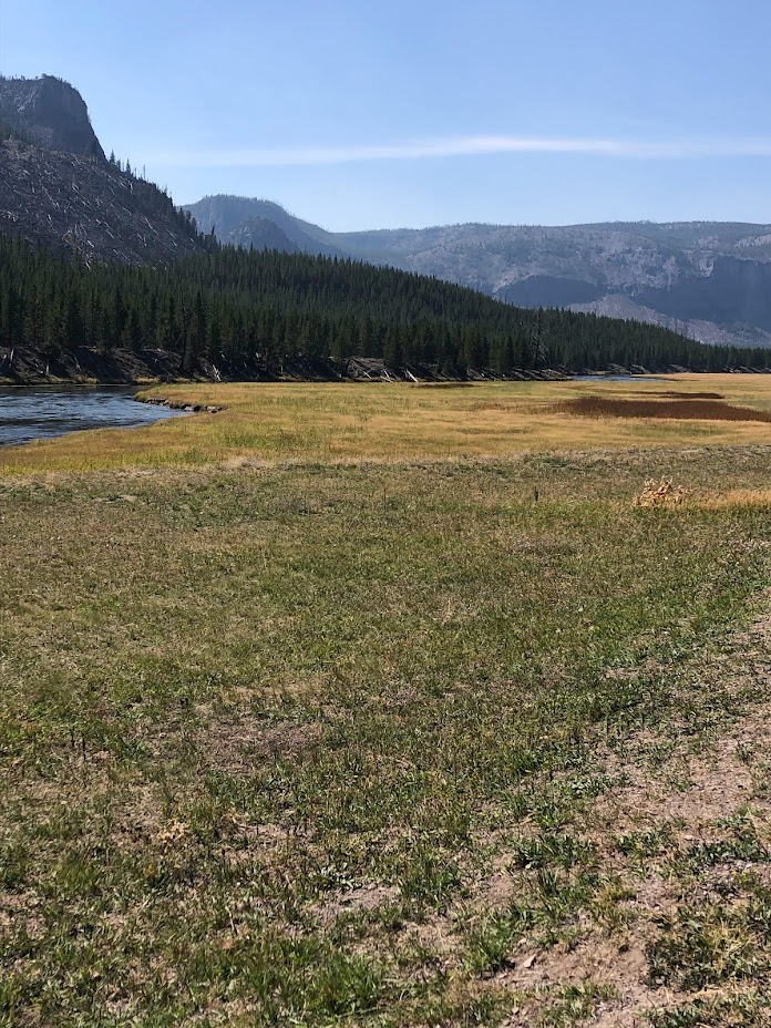 After entering the west entrance, the road travels alongside the Madison River. The views along the river are beautiful especially in the fall as the trees on the hillsides show autumn colors. There are often fly fishermen along the river here. Almost every morning when we entered the park, we spotted at least one bison along the side of the road.